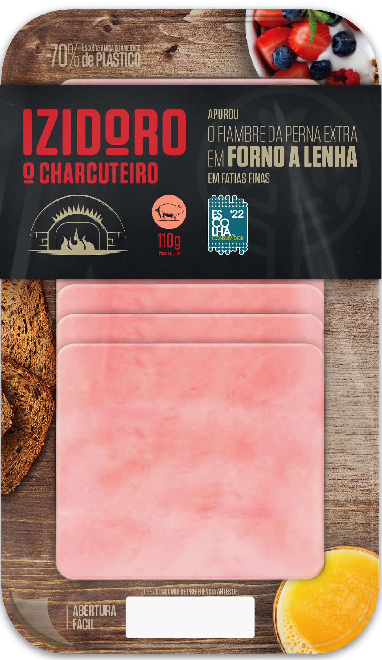 O nosso novo Fiambre Perna Extra Forno a Lenha é produzido com fumo natural, proveniente da lenha de faia, o que lhe confere um sabor e aroma genuínos a forno de lenha. Desenvolvido a partir de carne suína 100% portuguesa, está disponível em fatias finas, embaladas a vácuo, num packaging mais amigo do ambiente, com menos 70% de plástico, 100% reciclável e com abertura fácil.