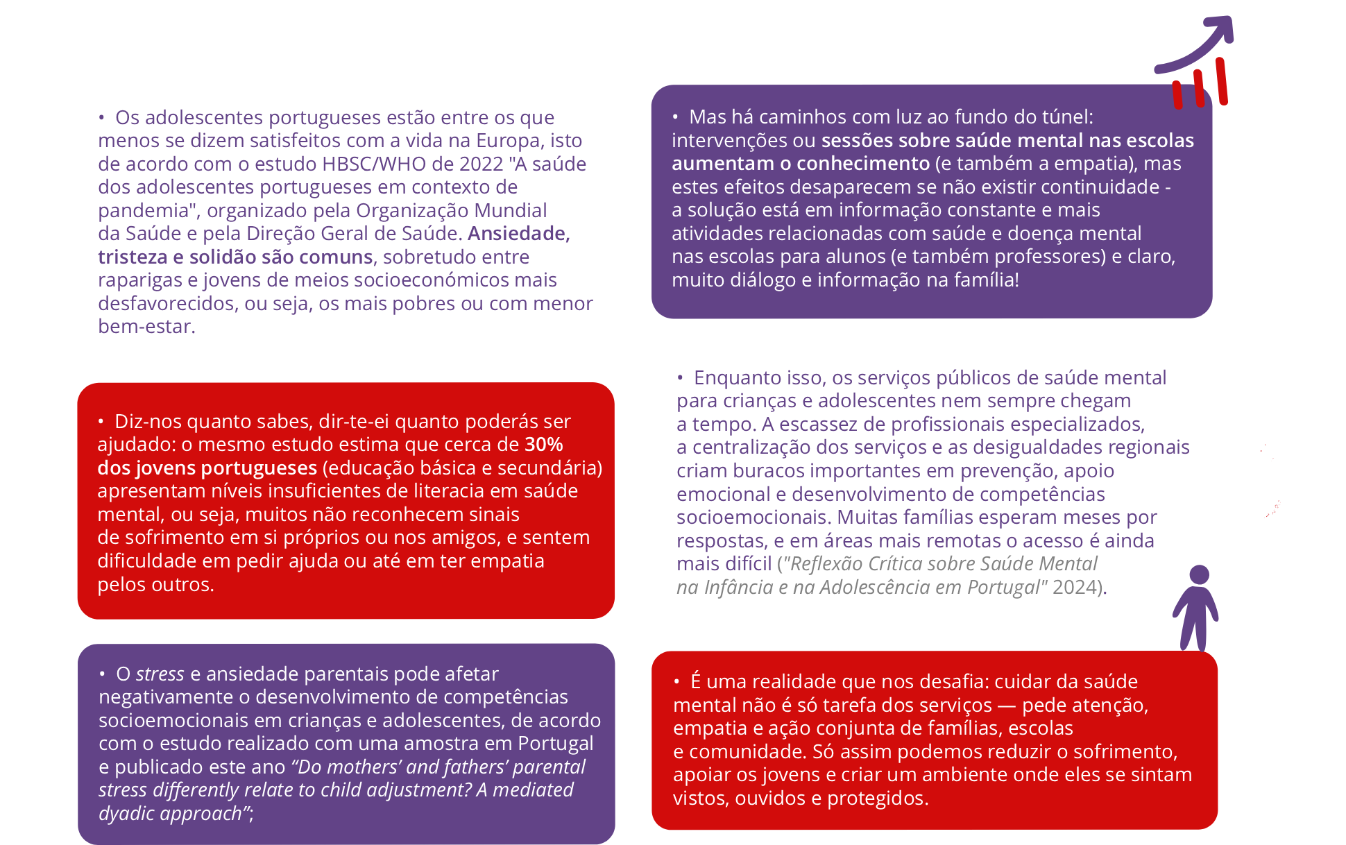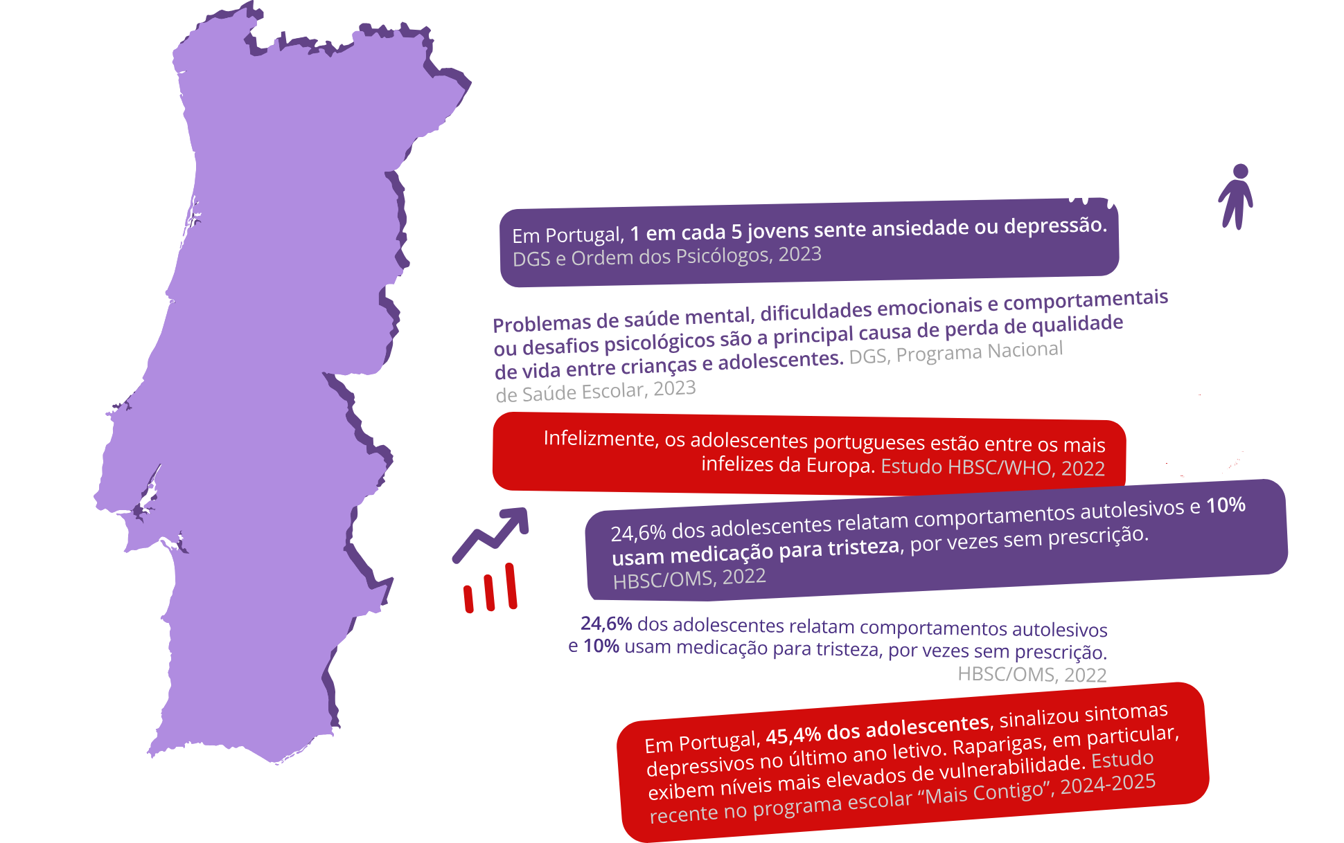 Em Portugal, 1 em cada 5 jovens apresenta sintomas de ansiedade ou depressão moderada a grave (DGS/Ordem dos Psicólogos). As doenças mentais são já a principal causa de perda de qualidade de vida entre os 5 e os 19 anos.
